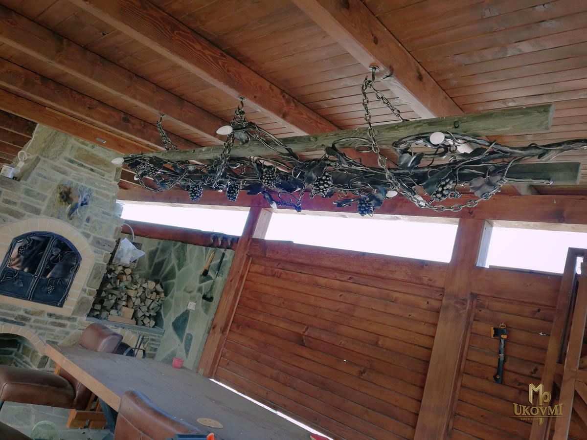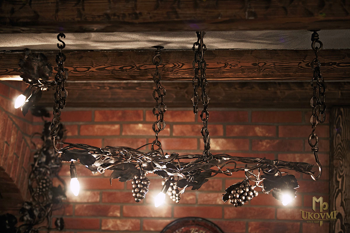 Stropné dobové svietidlo/tienidlo s logom UKOVMI - luster do interiéru - kované svietidlo vo vínnej pivnici