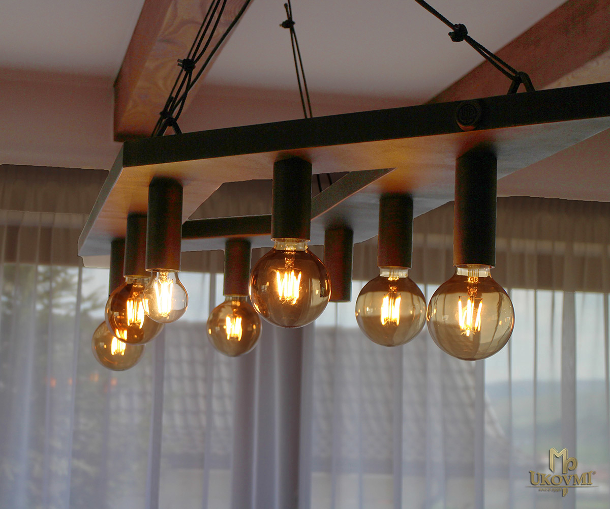 Kovaný luster - interiérový luster - jedinečná súhra materiálov kov-drevo prináša unikátne osvetlenie