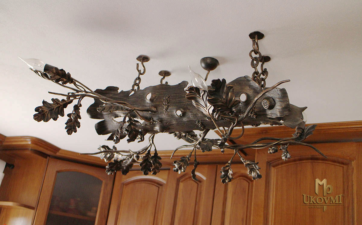 Kovaný luster Dub - interiérový luster zavesený na kovanej reťazi - výnimočné svietidlo do altánku, na chalupu...